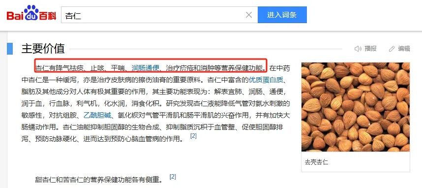 杏仁:有降气祛痰、止咳、平喘、润肠通便、治疗疥疮和消肿等营养保健功能。
