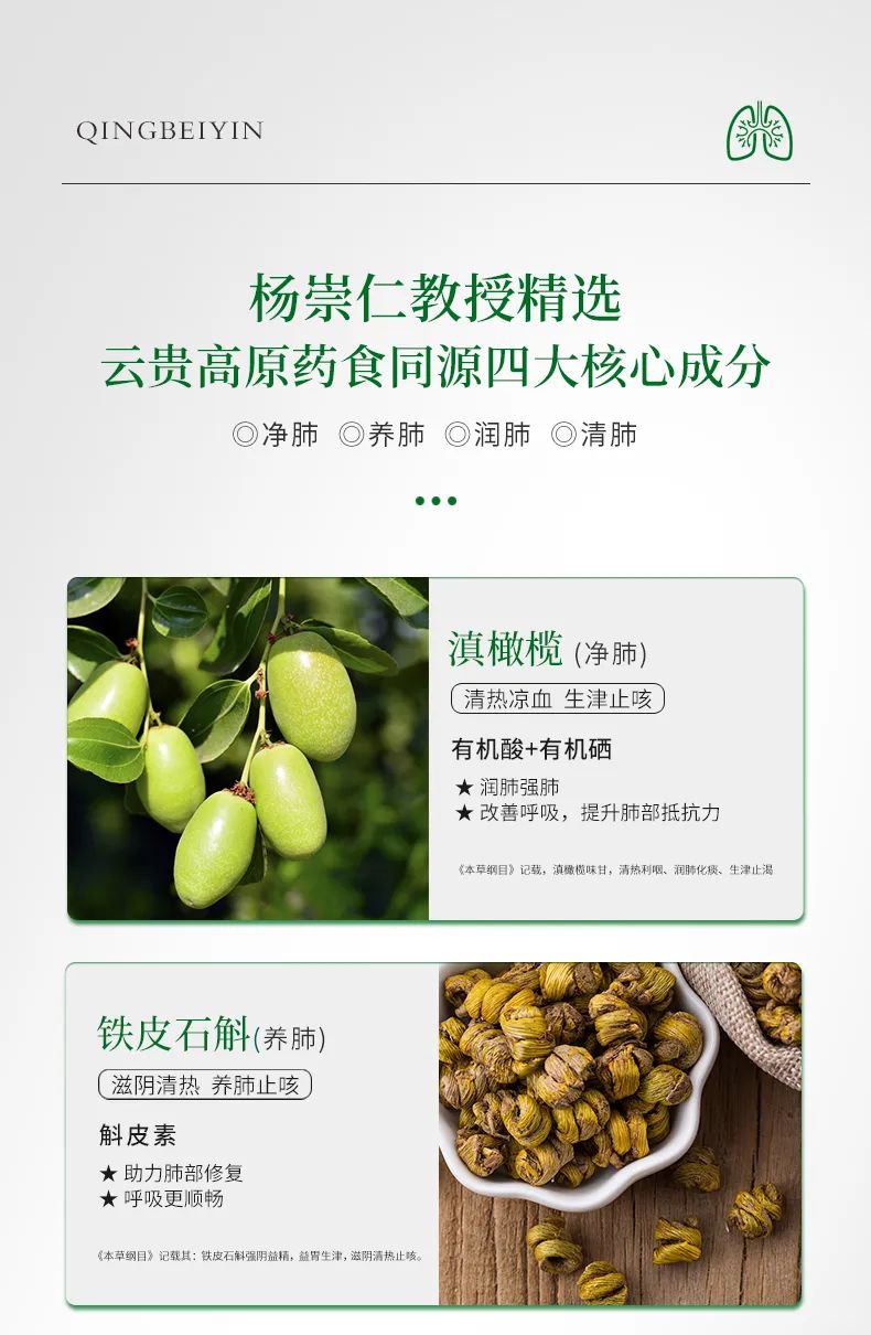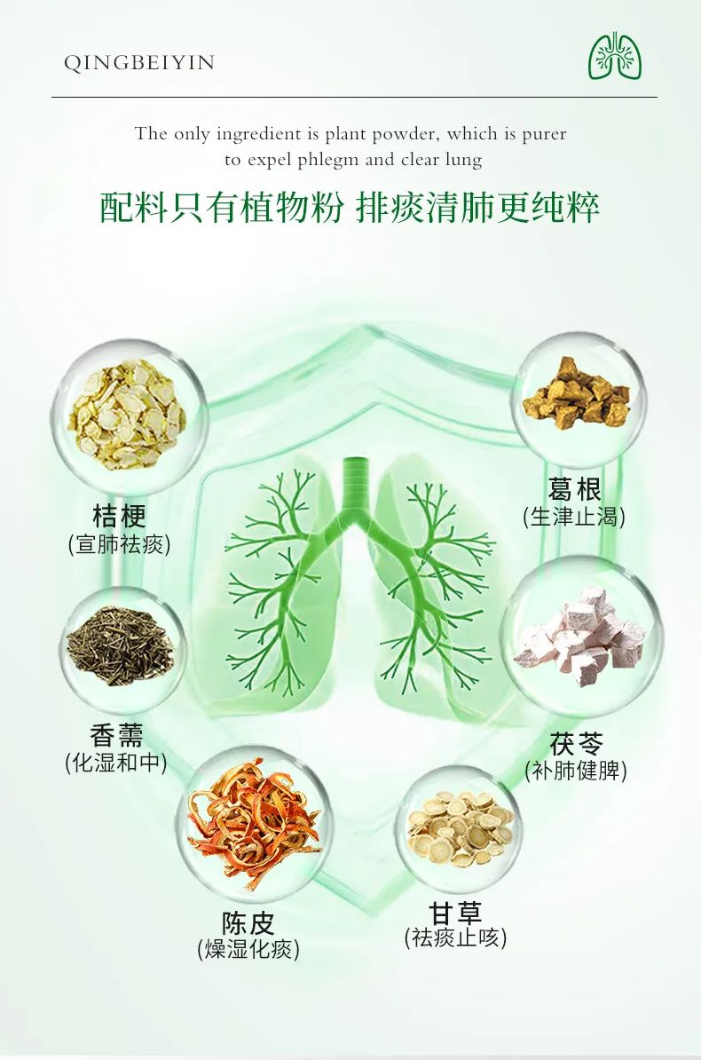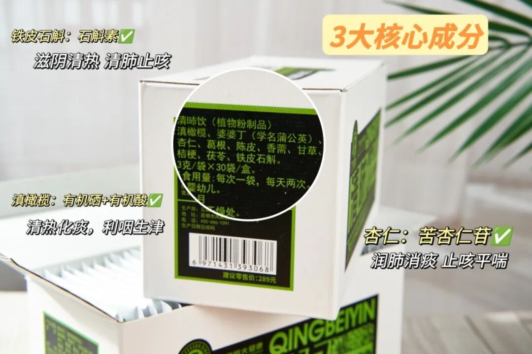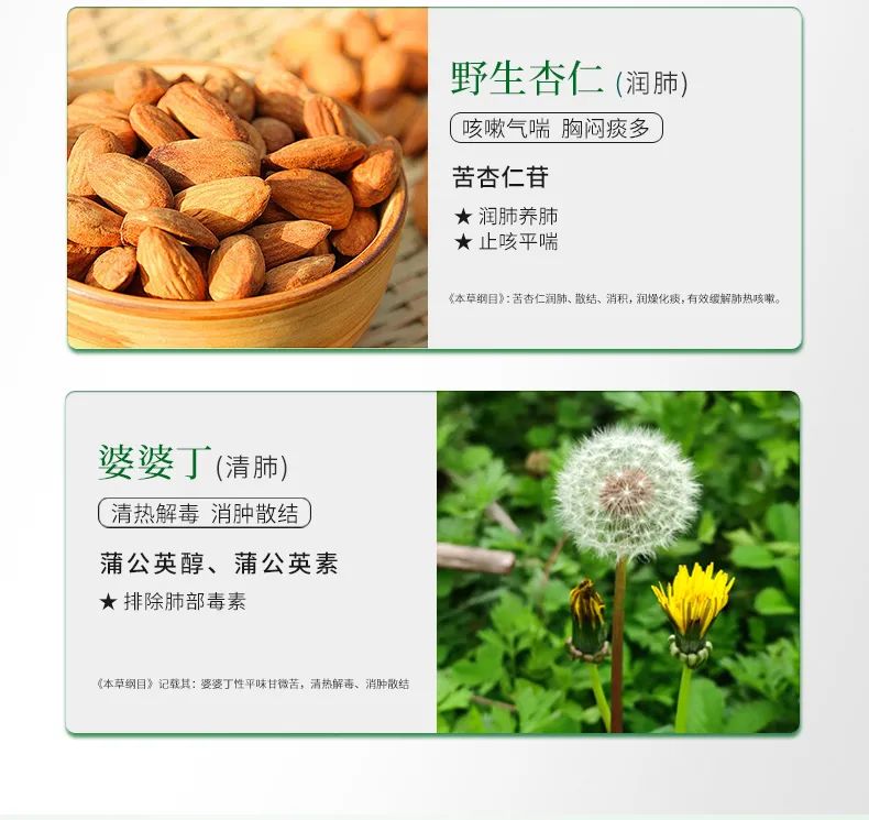这款产品被称为“肺部的清道夫”,里面的主要成分有滇橄榄 、 婆婆丁(学名蒲公英)、杏仁、葛根、陈皮、香薷、甘草、桔梗、茯苓、铁皮石斛等等。