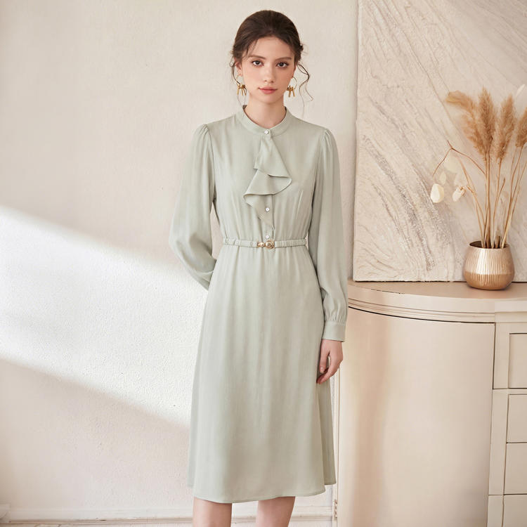 精致的立领搭配垂坠感荷叶边,柔化了衬衫裙的利落线条,增添了几分灵动与温婉,同时修饰颈部线条,显得优雅又不失干练。