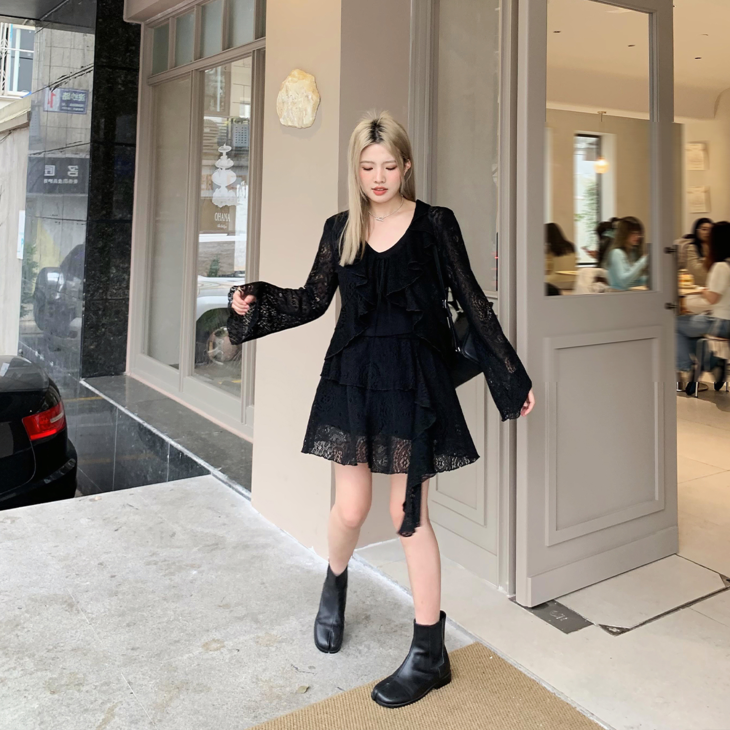 梦幻蕾丝材质 大V领 俏皮荷叶边的组合 纯欲感十足