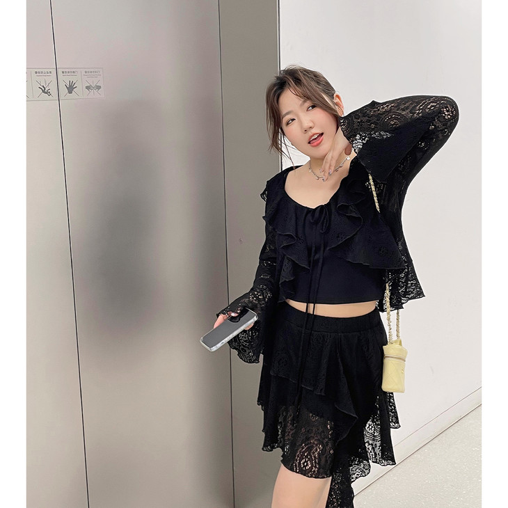 短款设计显高显瘦 蕾丝喇叭袖隐约透出手臂线条同色松紧腰的双层半裙 又乖又辣 约会必备款!!