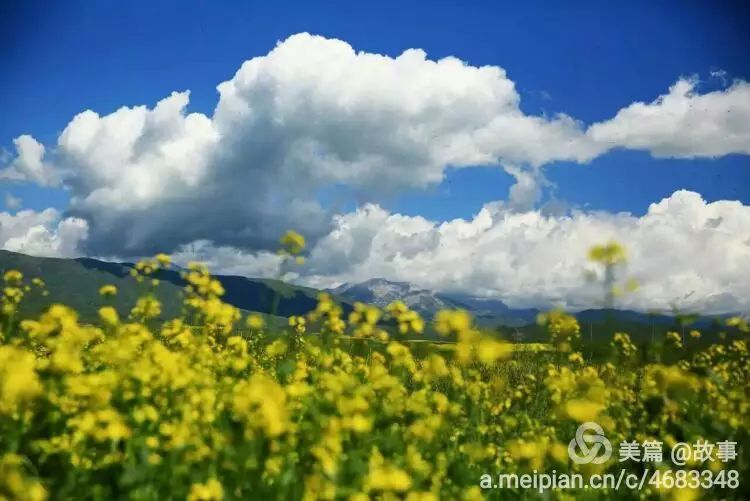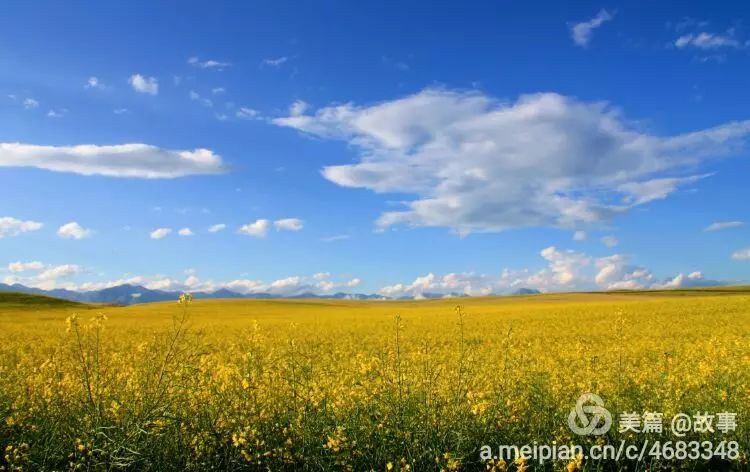 昭苏的天蓝得让人醉,朵朵白云仿佛伸手就能扯下一块,空气纯净地沁人心脾,油菜花席卷着昭苏大地。