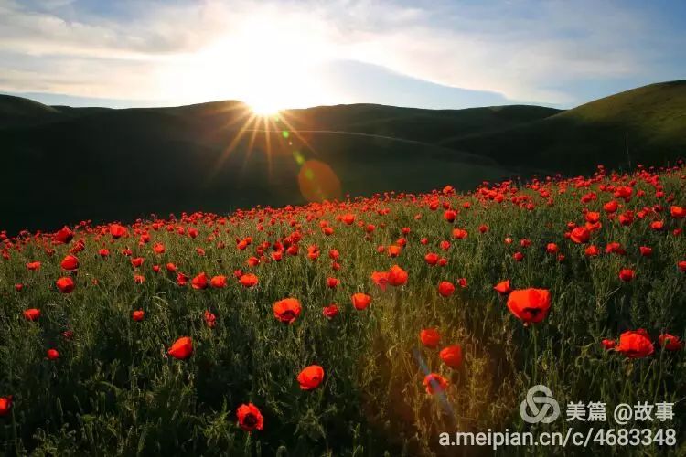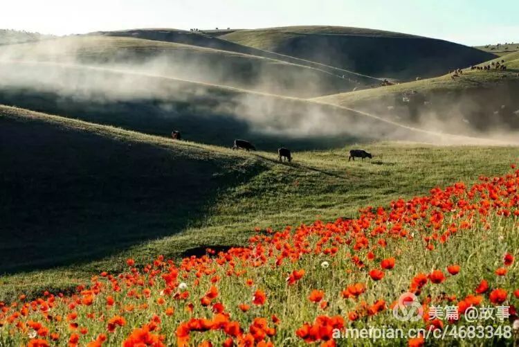 伊宁县山披上,一坡红艳,一个旭日东升的清晨,一幅红色浪漫图画,一个摄影人迷恋的地方。