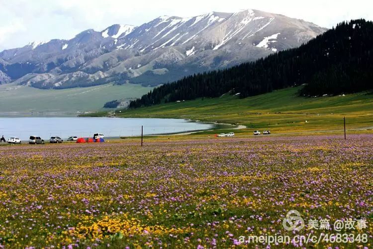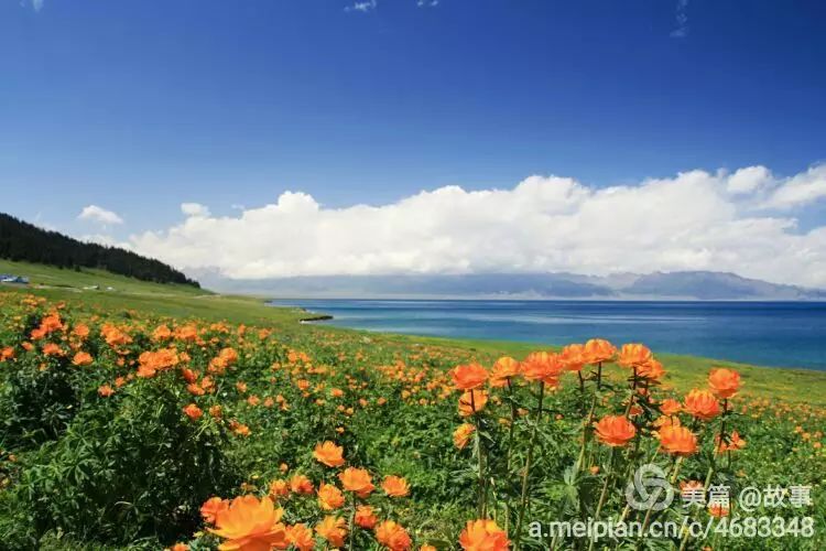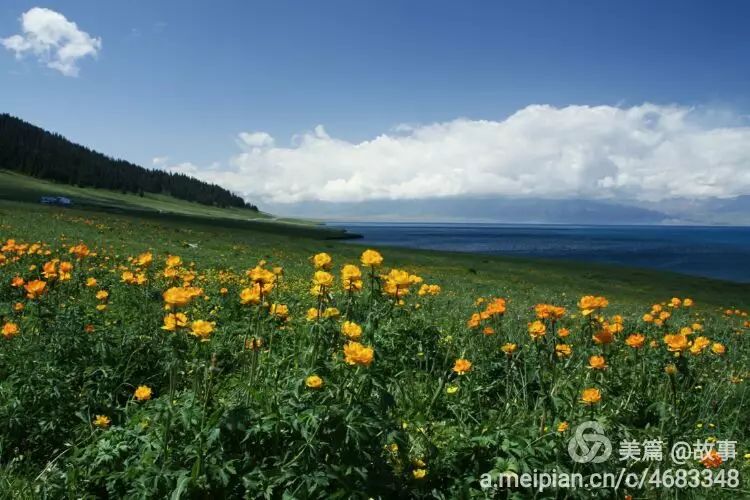 赛里木湖的金莲花盛开了,湖光山色,花海如潮,美不胜收。