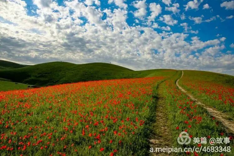 这样的蓝天白云,这样的红花遍野,这样的山间小路……
