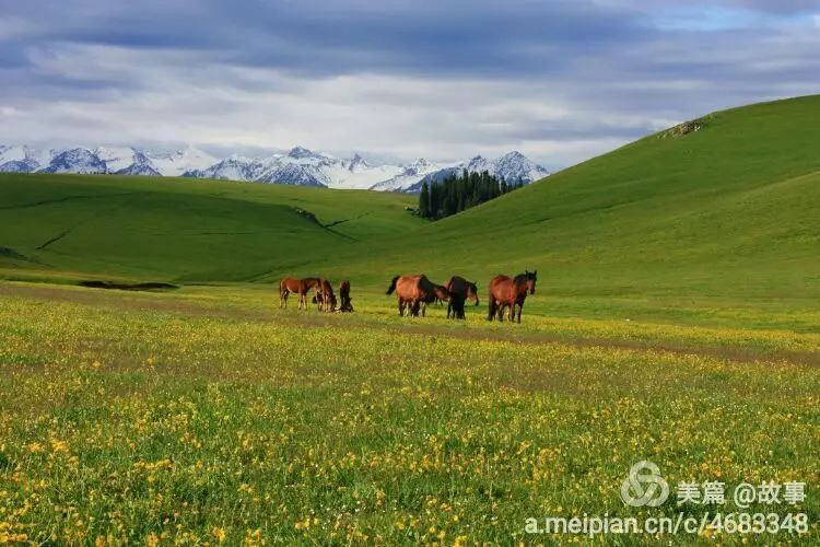 草原上的骏马,牧人,毡房;晨雾,雪山,牛羊;山恋,飞鸟,夕阳……