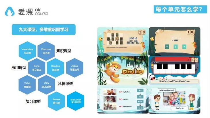 而爱课六级少儿英语,设计了更为系统严密的英语成长体系,从听说基础、语法句型、阅读写作、场景应用等多维度进行教学,难度是螺旋式上升的,全面培养提高孩子的英语综合能力和实际运用的能力。