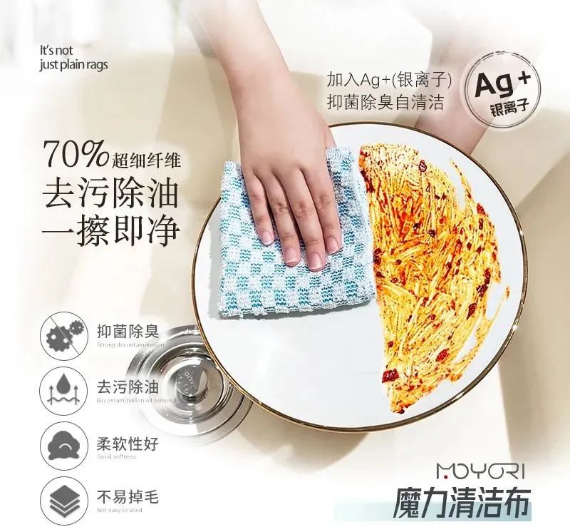 而MOYORI魔力清洁布具有隔离功能,超细纤维将油污吸附于纤维之间,阻挡进入纤维内部。