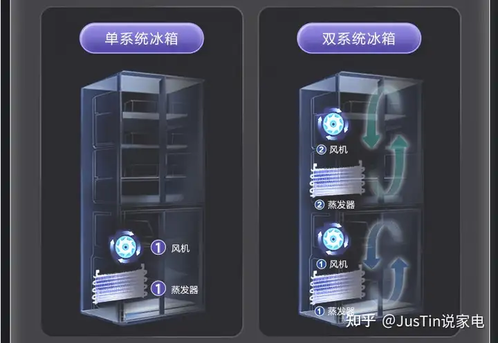 风道双循环还是一个系统,只有一个蒸发器,通过控制送冷量来调控温度,虽然说风道是独立的,而且在循环的过程中也会先经过净味系统,会有串味但味道比较小,如果净味系统给力甚至闻不出串味。