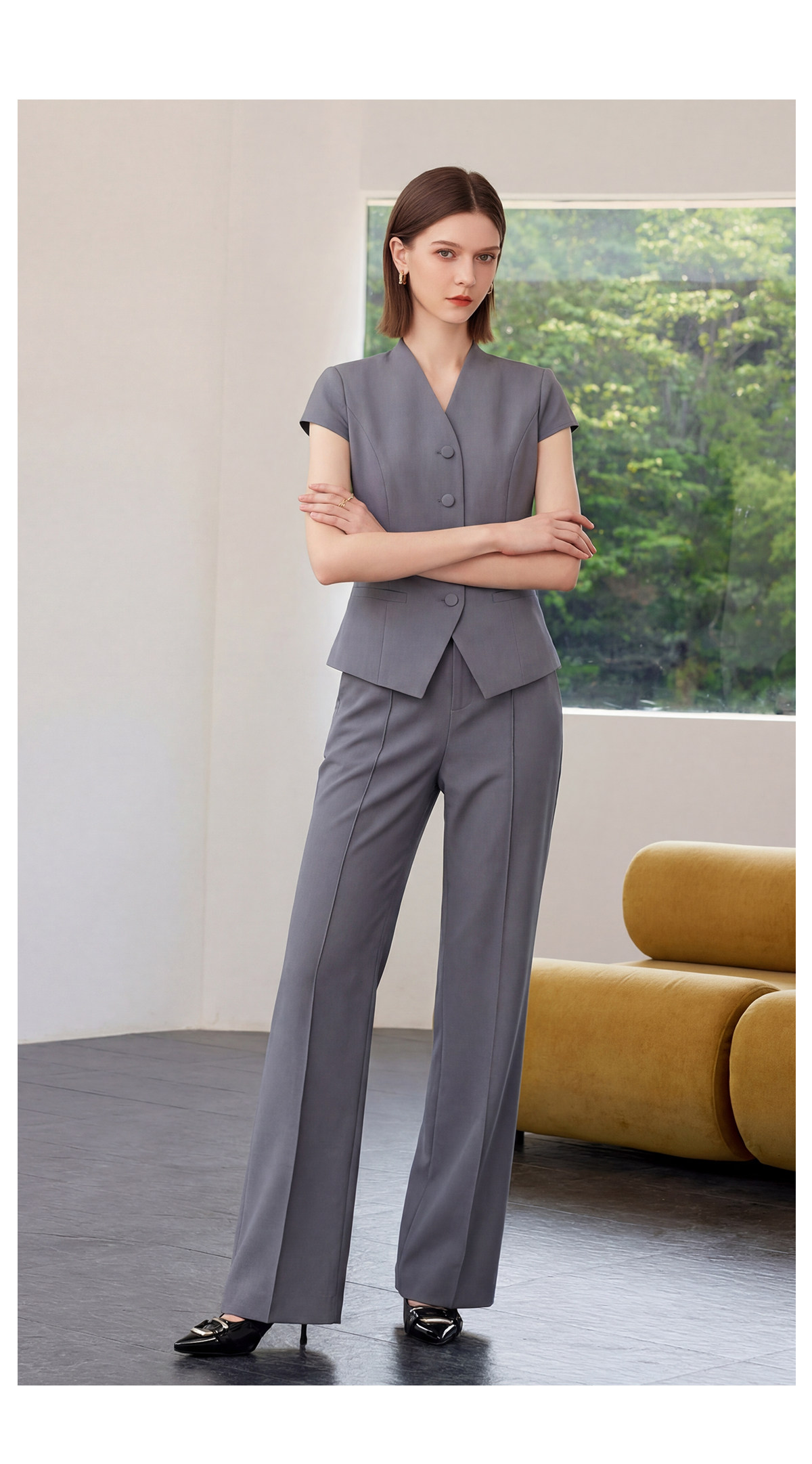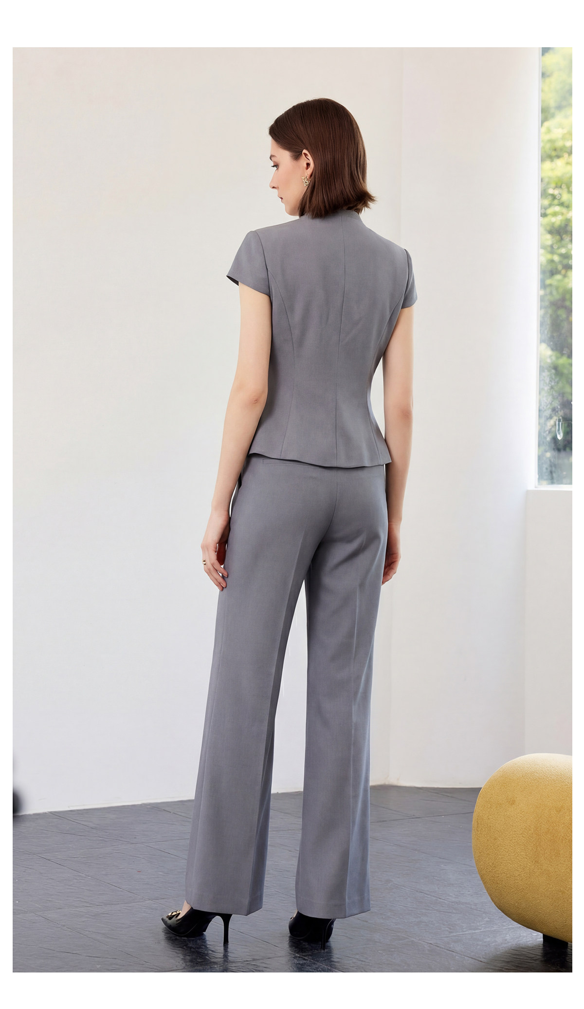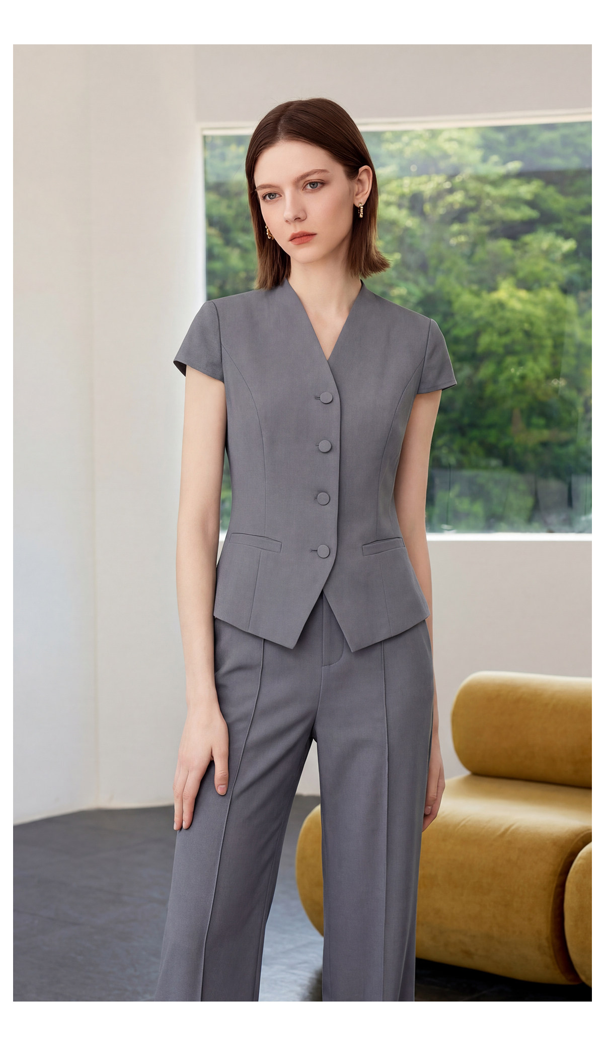 短款盖袖西装版型利落干练,无领V字设计弱化严肃感,多了几分柔和精致。