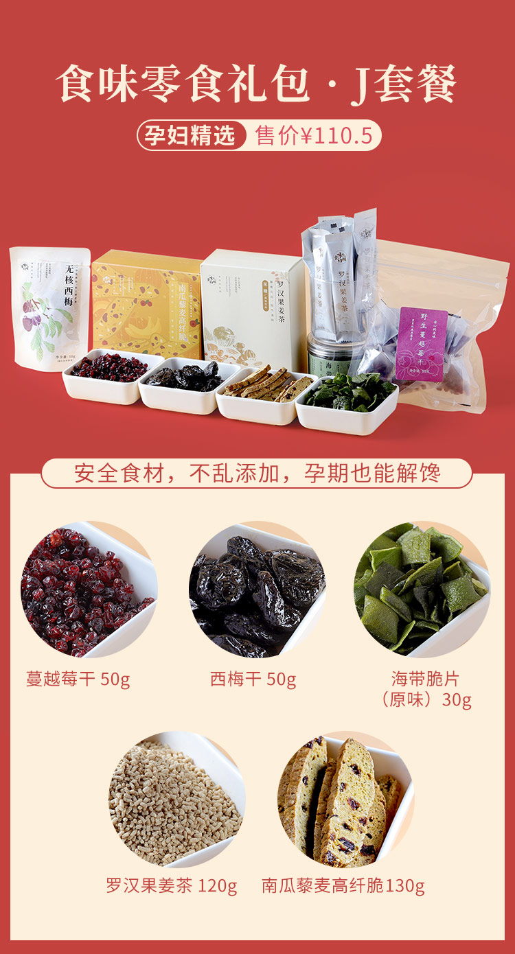 这个礼包里包含蔓越莓干,西梅干,南瓜黎麦高纤脆,安全食材,不多添加,准妈妈们孕期也能解解馋~