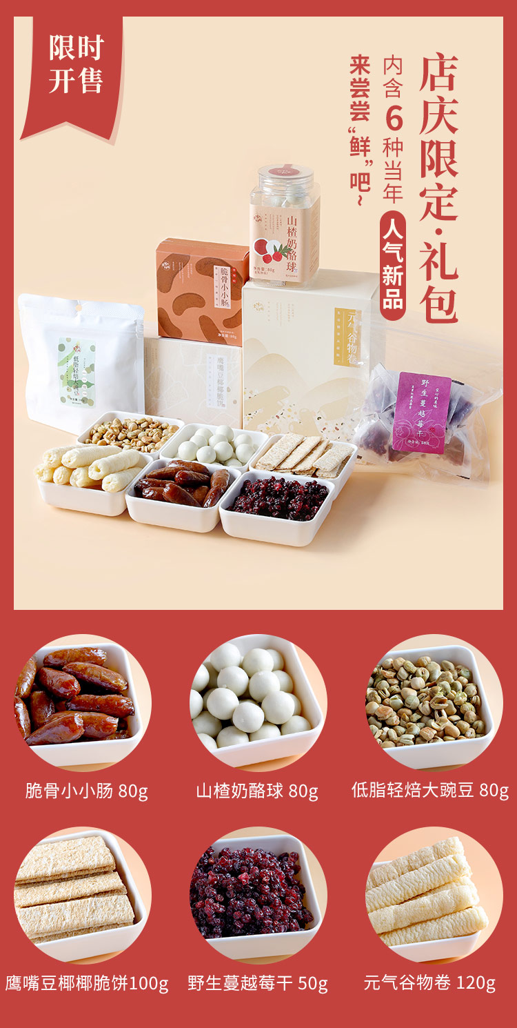 这款是我们为米马18周年特殊准备的一份礼包,内含6款高人气新品,脆骨小小肠,山楂奶酪球,大豌豆,椰椰脆,蔓越莓干,谷物卷,每一款都是用心挑选,这不仅是一款礼包,更是对你们暖心的爱呀~~~