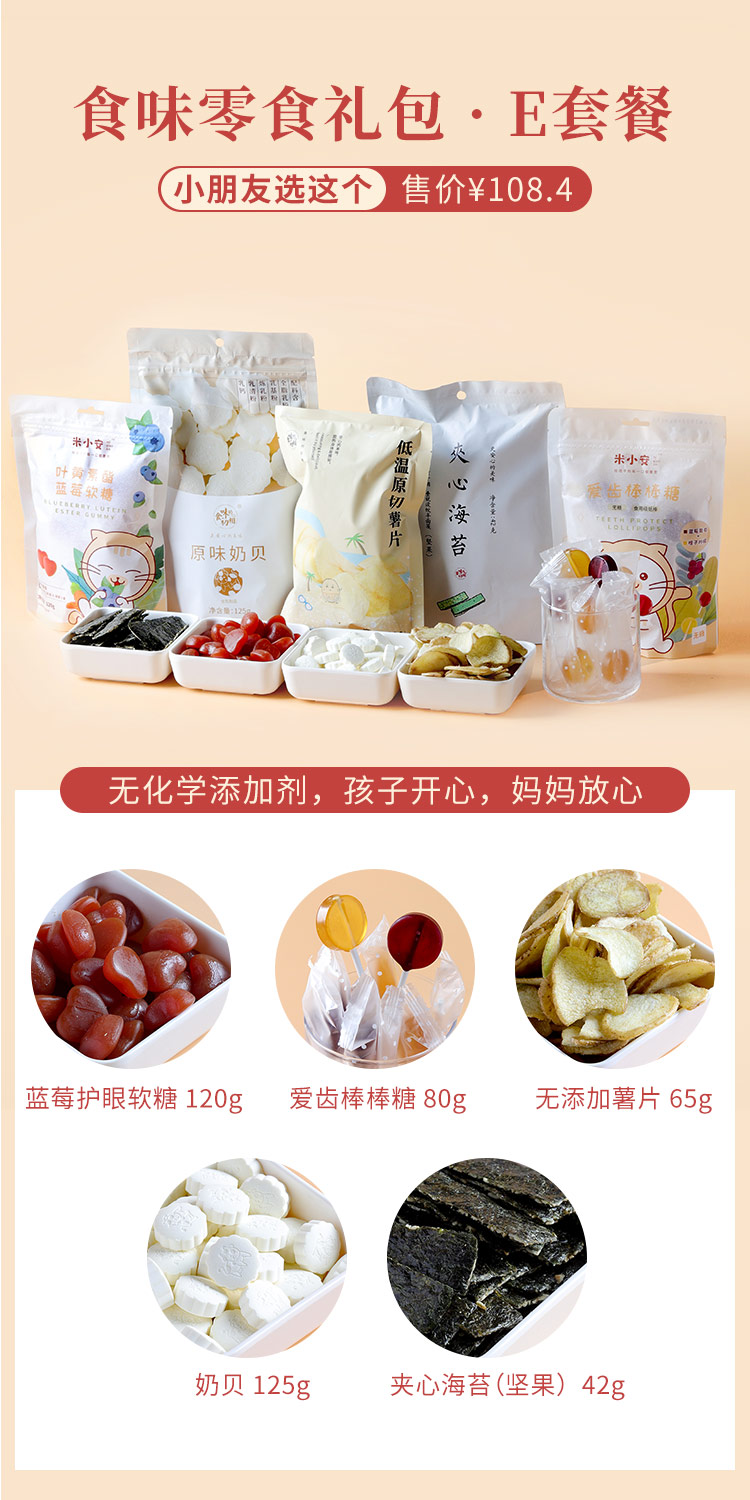 这是我们为小朋友准备的零食组合,5款都是非常适合孩子吃的零食,无化学添加剂,和人工增味剂,孩子吃的健康,麻麻们的首选!