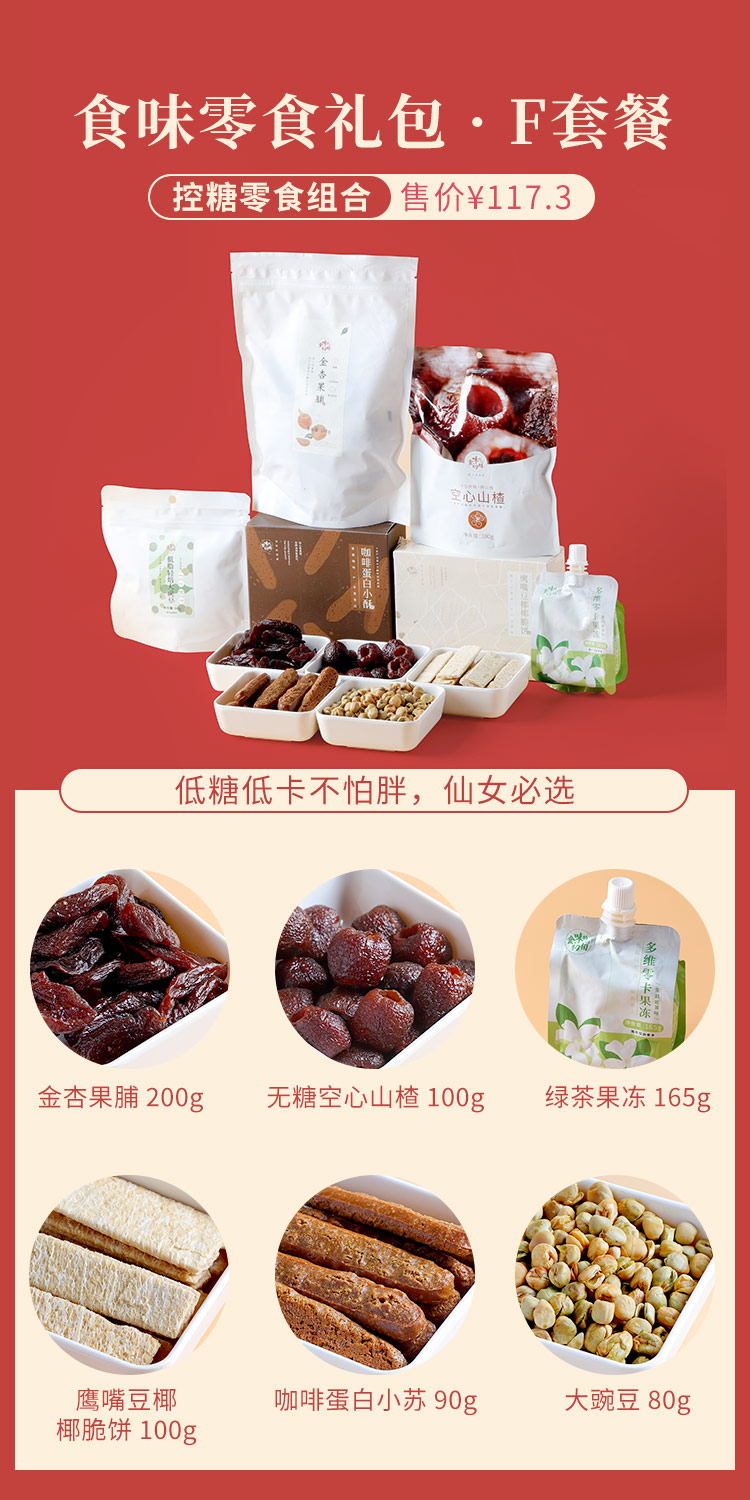 这个套餐真的绝绝子,是给想吃但又怕长胖的仙女们准备的,精选6款无糖、低卡的零食,老人小孩糖尿病患者,都可以食用哦~