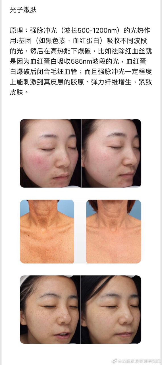 皮肤护理非常简明扼要,清洁,保湿,防晒,定期做光子嫩肤。我自己每年都会做一次光子,我自己以身作则,这样更有说服力,而且感觉很好。