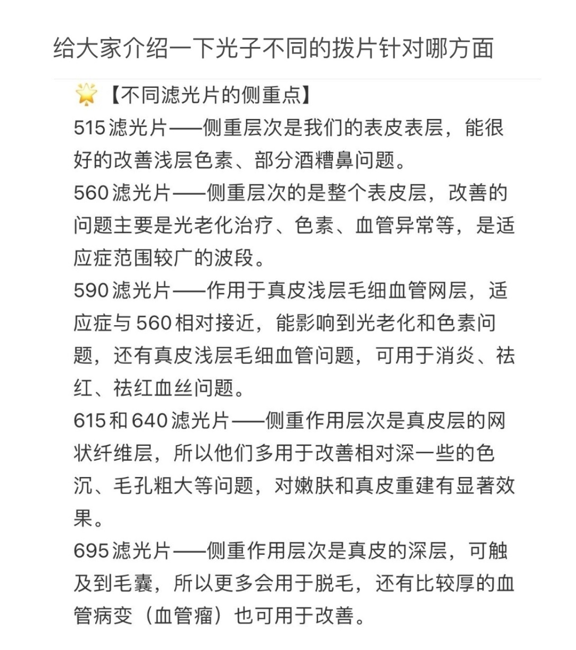 一共六种滤波片,实际操作中,一般会使用一到三种(两种居多),根据皮肤情况而定,它可以美白嫩肤,控油祛痘印,改善毛孔,抗老维稳。就连敏感肌姑娘也能做,因为光子可以促进胶原蛋白再生,增厚皮肤的角质层。