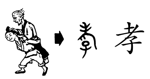 “孝”,“老”字取头,下加一“子”,“老”“子”相合,子负老为孝,子尊老为孝。