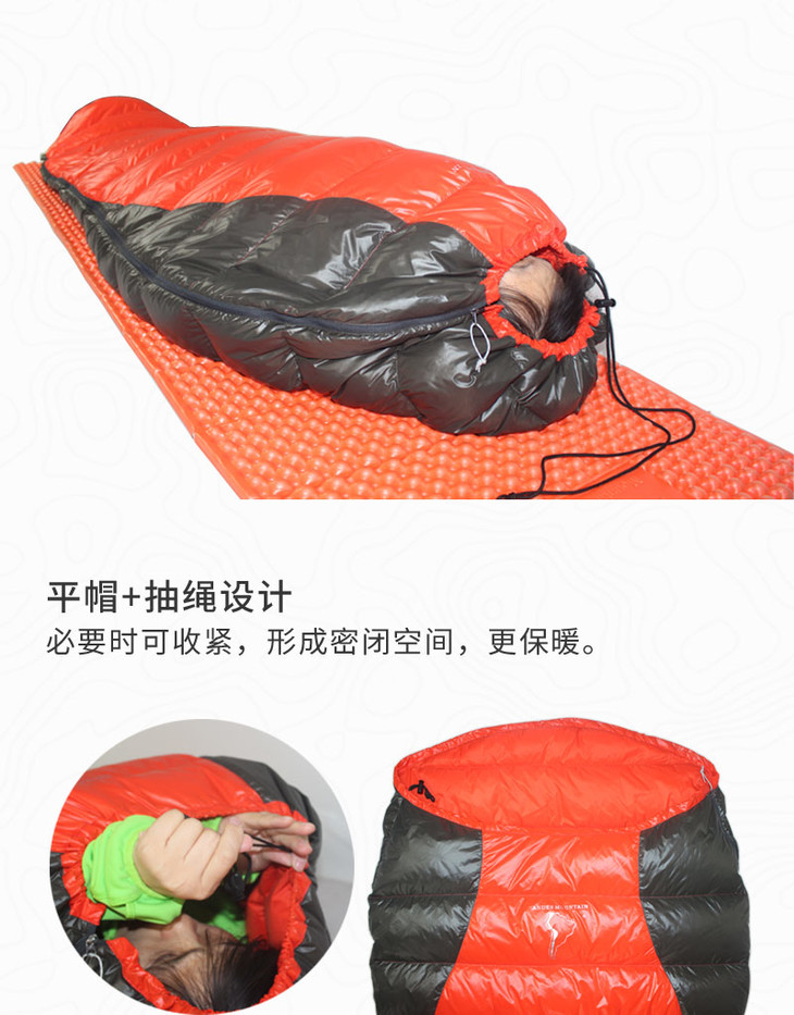3、平帽+抽绳设计,必要时可收紧,形成密闭空间,更保暖。