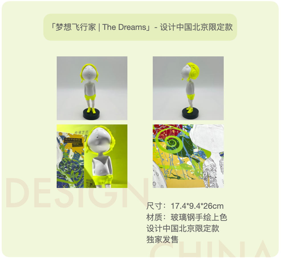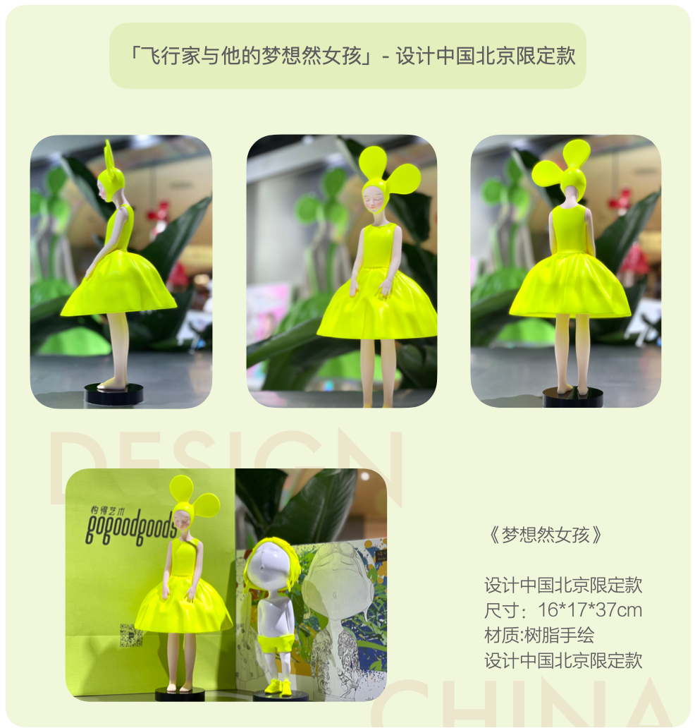 在本次展陈中,构得艺术带来了与设计北京深度合作、共同推出的超限量CP雕塑《梦想飞行家与梦想然女孩》。“梦想飞行CP”是集结了一群有才华有梦想的年轻人共同探索共同陪伴的精神载体,分别由艺术家吴琼老师与郭玲老师特别创作。其中,梦想飞行家运用了艺术家吴琼老师的主IP形象,构得艺术旗下IP然女孩则代表了世间无限美好。