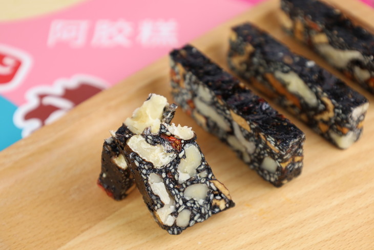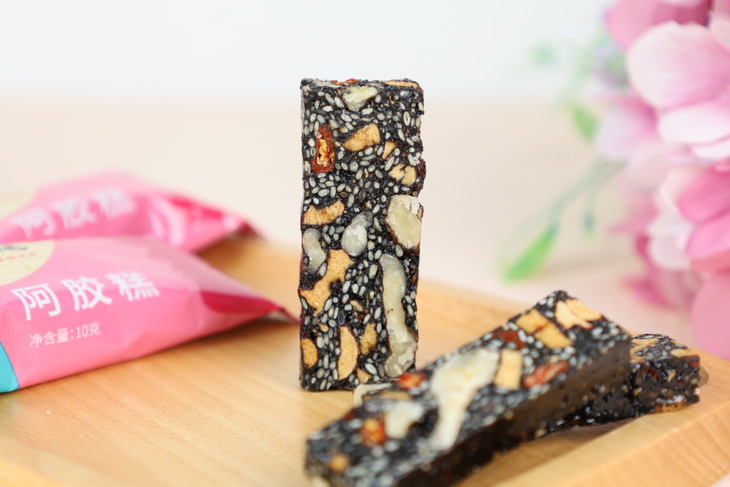 天方健阿胶糕,阿胶含量高达10%以上,再配以黑芝麻、核桃仁、红枣、枸杞子、桑椹,采用无黄酒配方,以枸杞桑椹浓缩液熬膏,还原食物本身味道。