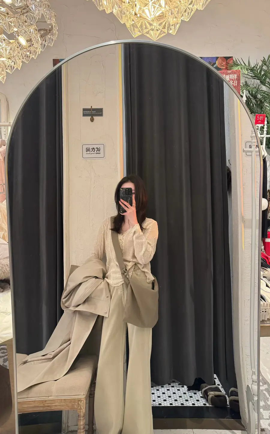 内搭杏色镂空针织,细腻肌理若隐若现