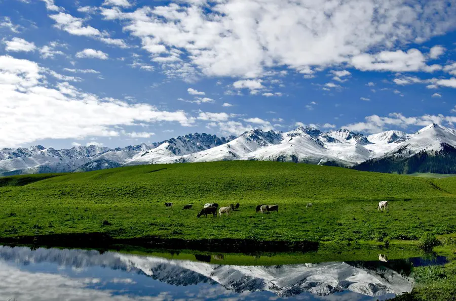 伊犁的美,除了平原、丘陵外,还包括山地、雪峰、冰川等多样的风景类型,伊犁草原之美,美在立体,草甸、繁花为近景,林木、雪山为远景,还有羊群、毡房点缀其中,处处是风景。山水间的勃勃生机与秀美风光,堪称大自然对这片土地最为深情的馈赠。