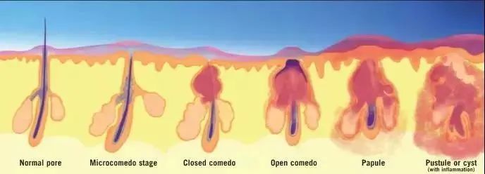 然而油性皮肤的皮脂腺过于活跃,当皮脂的显著增多,以及脱落的角蛋白的积聚加重毛囊皮脂腺导管角化异常,形成粉刺,如果再碰上炎症、免疫反应,就可能形成红色的炎性丘疹、脓疱、或是更严重的结节、囊肿。