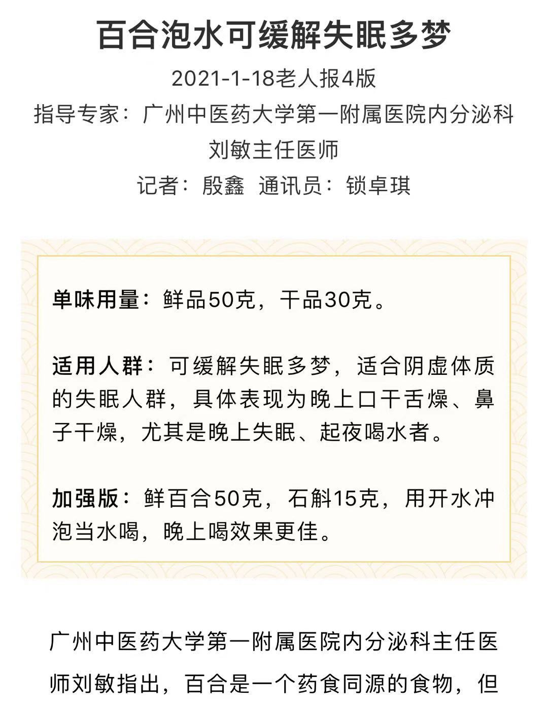 1、安神助眠:百合入心经,性微寒,能清心除烦,宁心安神,用于热病后余热未消、神思恍惚、失眠多梦、心情抑郁、喜悲伤欲哭等病症。每天睡前喝一杯百合枣仁茶,睡得更好。