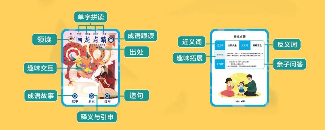 一张成语卡片,有12处可点读的知识,并且有名师视频讲解成语故事,身临其境,好玩有趣。