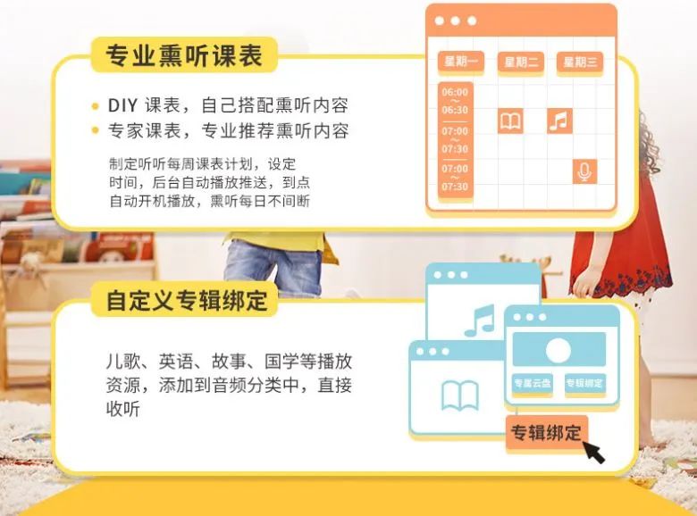 ❹ 更具个性化的学习体验,可以自定义专辑绑定,把喜欢的音频进行分类,然后按类收听;还拥有DIY课表和专家课表2种,自行制定每周课表计划,设定时间,后台自动播放推送,到点自动开机播放,熏听每日不间断。