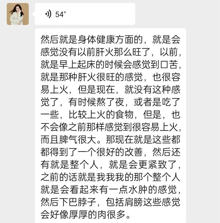 精神状态佳、肩膀不痛了、皮肤也通透了,身体也更加柔软!一个字,好!