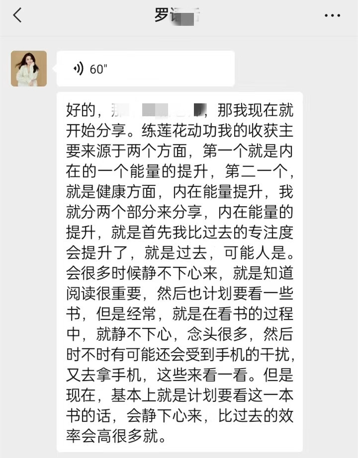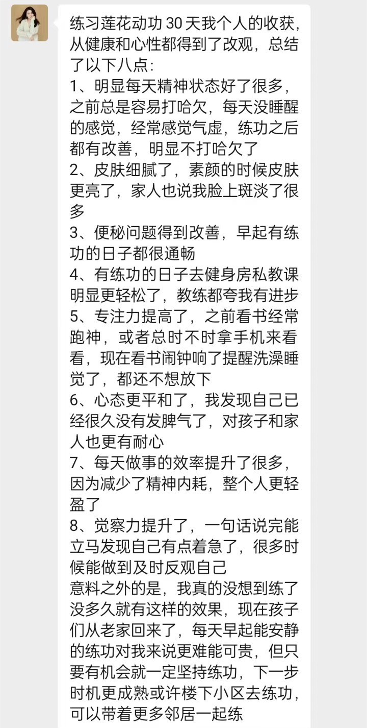 罗老师也坚持练习莲花动功,她说练习后主要是内在能量的提升,以及健康方面更好了!