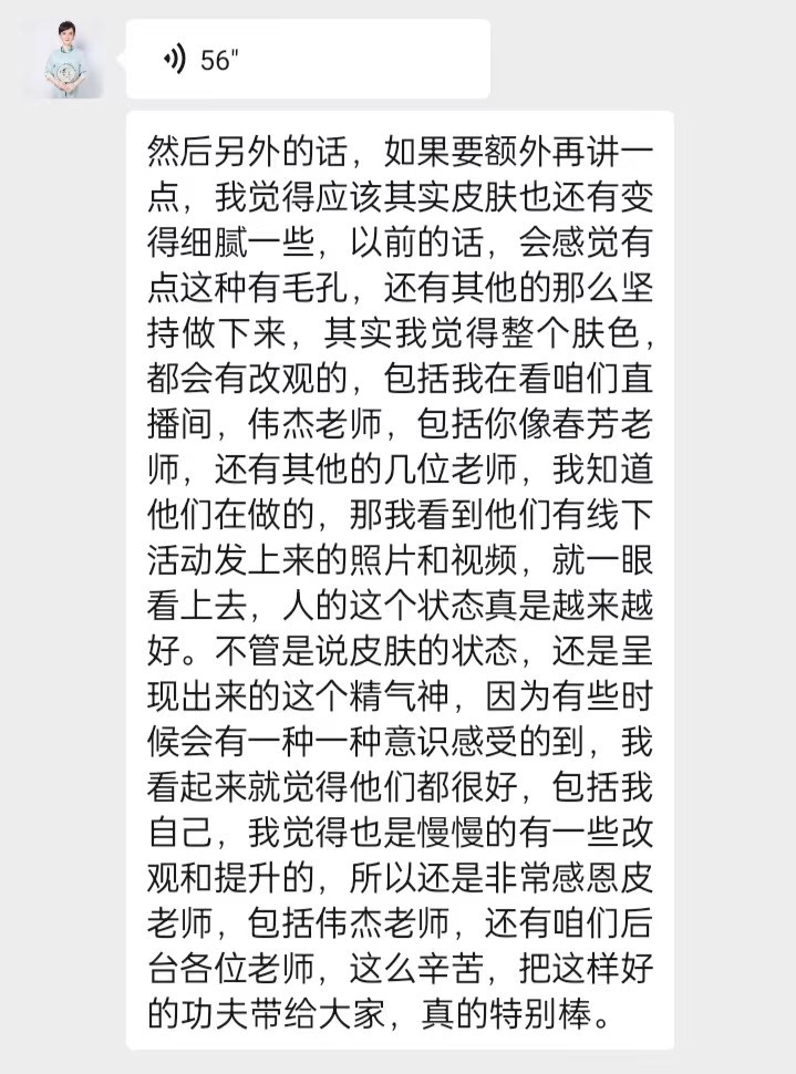 很多家人紧紧跟随皮老师,练习了一段时日,都觉得效果非常明显,好处多多,下面我们一起看一下其他老师坚持练功的感受吧!