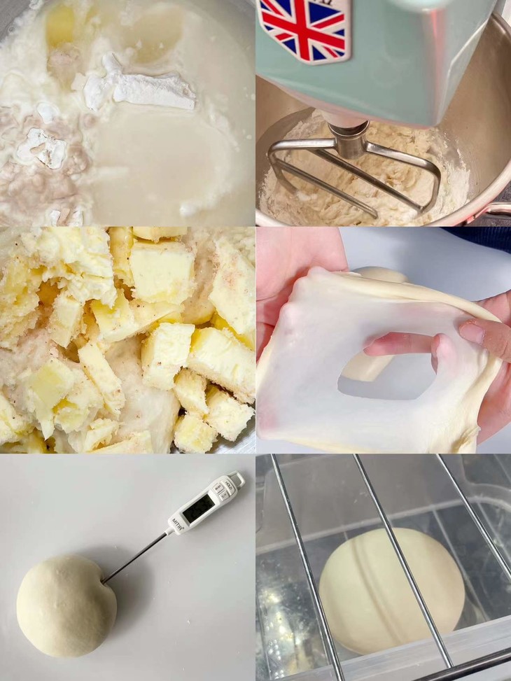 1.除黄油和盐之外的材料加入厨师机桶~低速2-3档搅拌至无干粉,成团,约2-3分钟,转快速5-6,搅拌约3-4分钟,检查,能扯出厚膜,有韧性,破口有锯齿状~