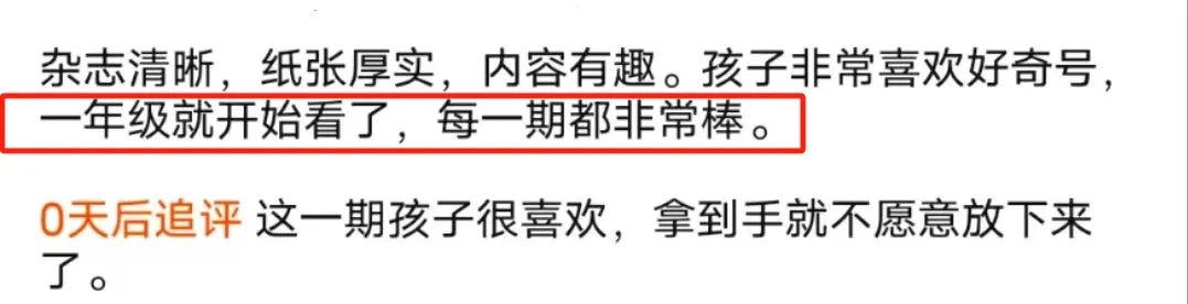 16开彩色大内页,插画清晰,字体大小合适,不会对孩子眼睛造成疲劳。每月15日会寄出一期,一期3本,科学刊+人文刊+中英双语读物。《好奇号2024》全年36册,原价720元,新年限时开团288元,一顿大餐的钱,就可以搞定孩子一年的阅读书,真的太值了!点击链接,立即订阅▼