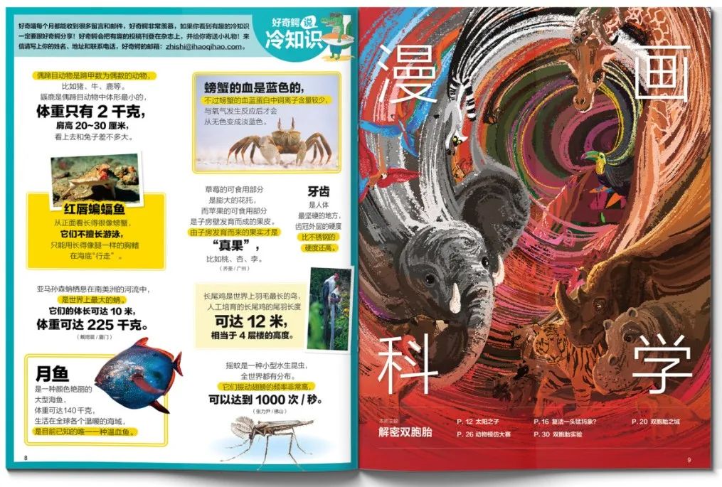 十点君拍着胸脯保证,《好奇号》真的是少有的全科通识杂志!每期5大板块,涉及科学、自然、历史、文化、文学五大领域,在国内很难找到内容如此丰富的少儿杂志。①“科学前线”栏目,涉及太空探索、生命科学、人工智能、地球文明、物理、数学等前沿科技,激发孩子探索世界的兴趣。②“漫画科学”栏目,通过精彩的漫画和有趣的故事带领孩子们探索万千世界,为千奇百怪的自然现象寻找科学的答案。这个板块的内容轻松、有趣,又含有很多有用的知识,也是我家娃最喜欢的板块之一。①“世界故事”栏目,每期都会介绍不同国家和地区的世界文化、自然风貌、民俗风情、民间传说、历史传统。世界上最小的国家在哪里?智利的牛仔竞技有多好玩?薯片是怎么发明出来的?②“考古少年”栏目,为小朋友解读人类历史上的考古发现、历史文明和发展。为什么在陆地上能发现这么多沉船呢?古埃及真的有藏宝图吗?还会拓展介绍一些历史趣闻、神奇传说,或者对话考古博士,解答疑惑,引领孩子们进入神秘的考古世界。③“好奇文学”栏目,为孩子们提供经典的故事,带他们进入一个多彩的文学世界。这里有奇诡神秘的奇幻都市,各国的民间传说,有关远古的神话故事......读这些经典文学故事,孩子的文学素养蹭蹭蹭地跟着提高~《好奇号》杂志每期还有一本中英双语读本,包含多个有趣的短篇小故事。每一页都是中英对译,每一篇还贴心地标出了“生词表”~这些充满想象和童趣的故事,不仅可以点燃孩子想象力;更是孩子英语阅读积累的好帮手,在阅读中培养英文的语感。不只是孩子们的超量知识库,更像是把丰富多彩的大千世界浓缩进一个体系中,让孩子可以全面的、有逻辑的看到这个世界。点击链接,立即订阅▼