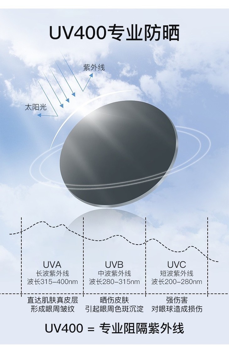 🔻专业防晒镜片,UV400防晒力,100%阻隔紫外线,偏光效率≥95%