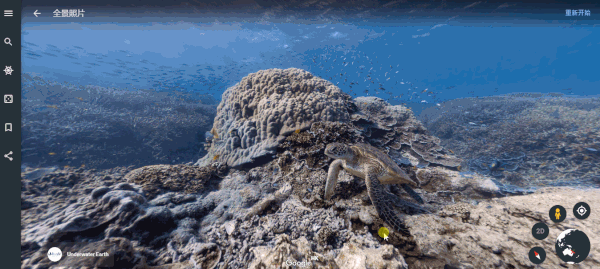 我们可以潜入深海,一只乌龟、鲸鱼、魔鬼鱼就会出现在你眼前,转动镜头就会看到一群遨游的海鱼,巨大的珊瑚礁就在眼下(深海恐惧者慎入)。