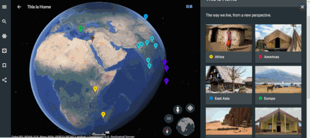 比如,在“This is home我的家园”主题下,可以去各个地方看别人怎么生活的,地球上出现的每个标记点都可以进行探索。