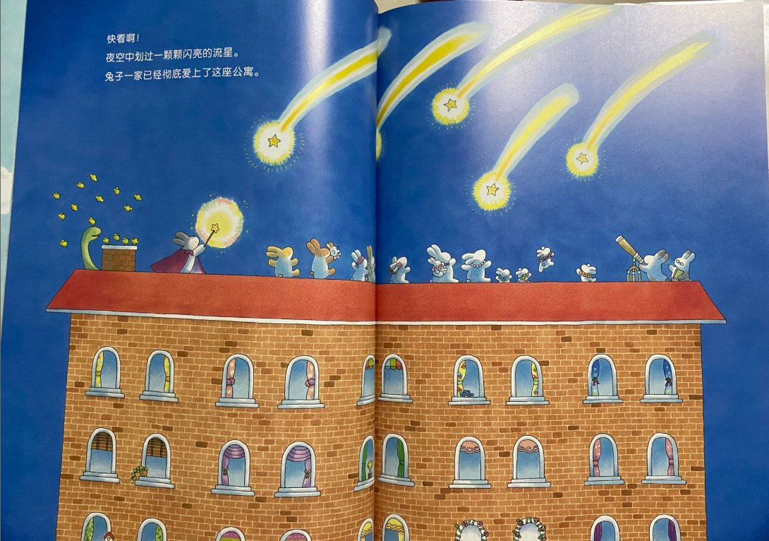 每一家的兔子都在忙着自己的事情,比如搬进来的兔子一家,开始吃早餐,围坐在地垫上,一起吃三明治,可以和孩子探讨,吃完早餐它们接下来干什么?
