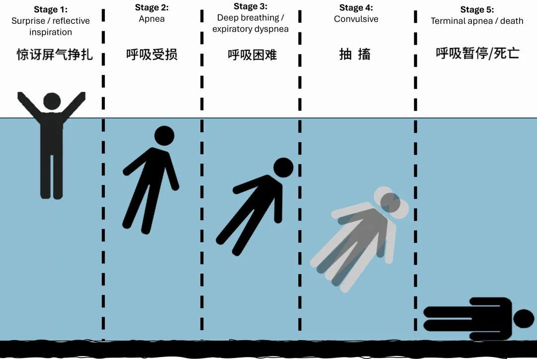 当一个人突然落水时,会本能地屏住呼吸,防止水进入呼吸道。同时,溺水者还可能会不断挣扎,维持手脚和头都在水面之上,寻求空气。一般不会游泳的人只能在水面上挣扎20 ~60秒。