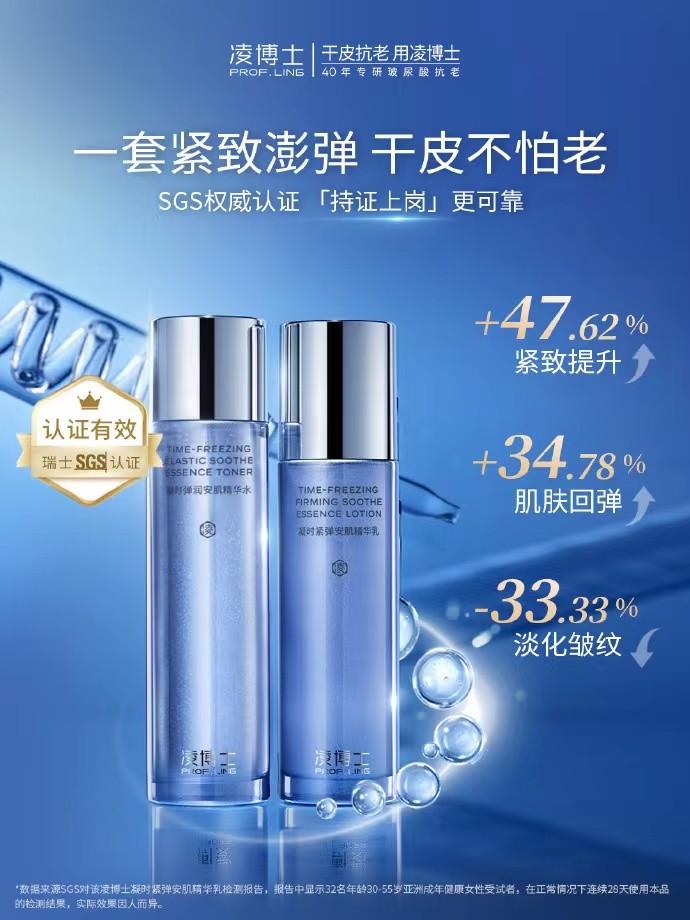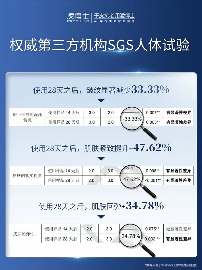 SGS人体实测表明,受试者仅连续使用「凌博士青春水乳」28天,皮肤紧致度提升高达47.62%️