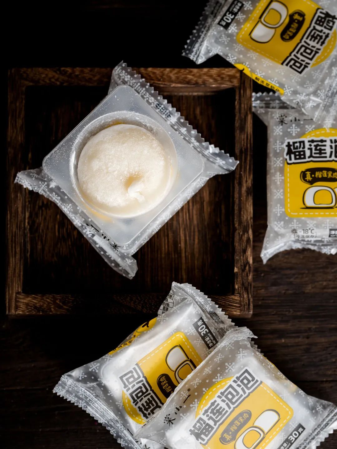 因为榴莲泡泡是冷冻储存的,所以根据解冻时间不懂也有不同的口感哦!
