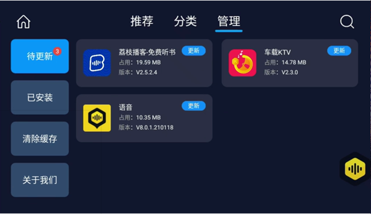 步骤1:先联网,然后到【车必装市场】-管理里检测下车机助手是否是最新的版本,
