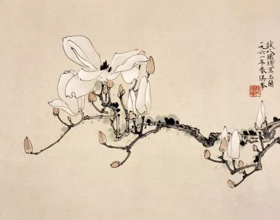 初春皎洁玉兰花,九瓣花冠肥且大。淡墨勾写可中侧,正侧反转多变化。石绿朱砂点雌蕊,雄蕊上色需变法。赭石调墨点花萼,数笔茸毛不细耍。立在枝头如玉盘,不受尘垢生光华。