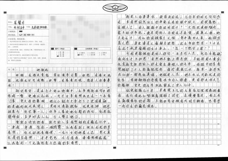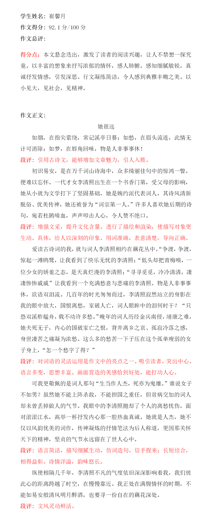 读诗文使人灵秀,品诗人让人深刻。诗人李清照的人生经历和她的词作一直是令后人惊叹不已的宝贵财富。文章驾驭语言能力很强,以词句贯穿全文,写出了词人颇为坎坷崎岖的一生,也写出了作为古代女子的卓尔不凡,表达出了自己深深的敬慕之情,可见对词人词作的熟识程度。希望崔馨月同学继续秉承对古诗文的热爱,常品读多练笔,写出更多更美的文章。
