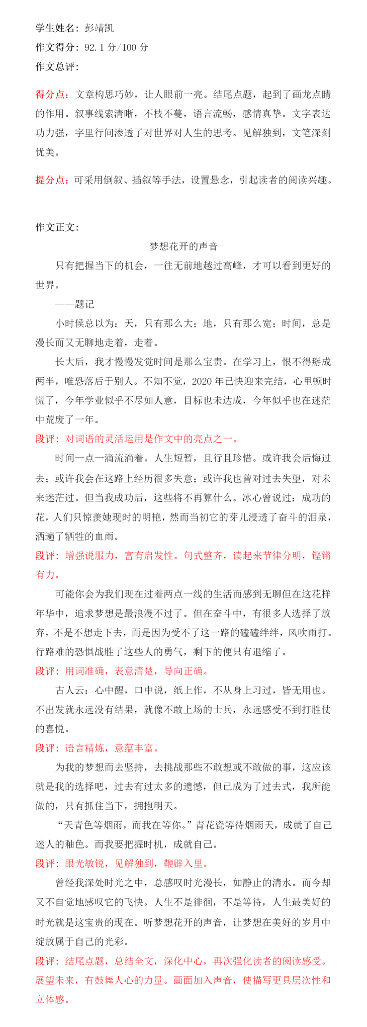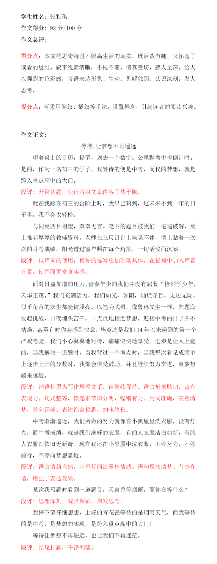 俗话说“感人心者,莫先乎情”,小作者笔随心走,驭情于文,心理描写逼真、细腻、动人,写出了一个青春、迷茫而多思的初三女孩儿的真心话,有内省、有期许。文章语言温婉澄明,清新流畅,让梦想多了一份亮丽的色彩,也让梦想多了一份理性的思考。心有意态,一任天然,这样的真性情,这样的真写作,其乐无穷!中考是一次成长,也是一场蜕变,希望你梦想成真!