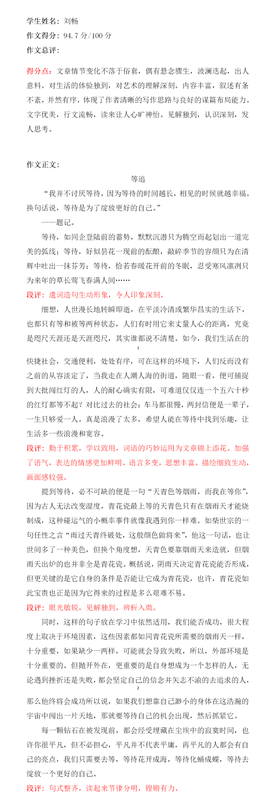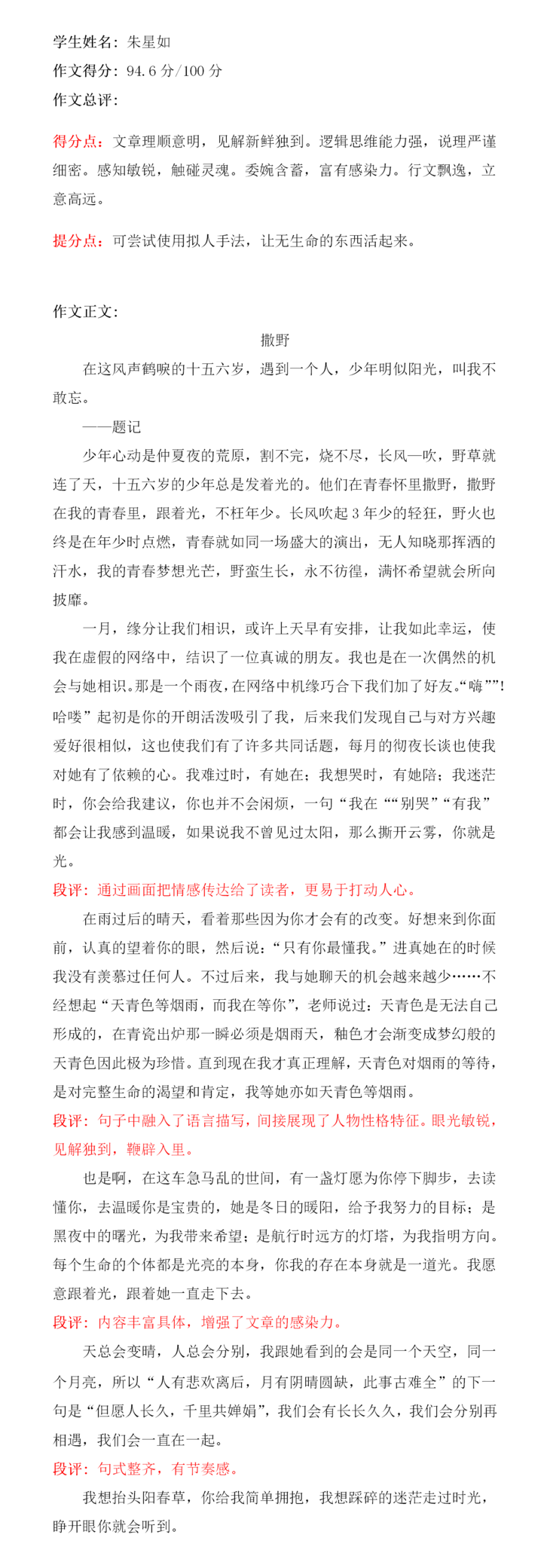 文章精心选材出新意。诗意的标题、独特的结构、灵活的句式、凝练的语言,无不展现出小作者的个性并彰显其才华底蕴。行文流畅,作者以深情、细腻的笔触让我们在感受到情感熏陶的同时得到理性的启迪,句句掷地有声,能够引起读者的共鸣。文中说“等待是为了绽放更好的自己”,老师相信你会在青春这盛大的远行中,观世间百态,增长见识,开阔视野,学会以更谦逊的姿态面对世界,与更好的自己相遇!