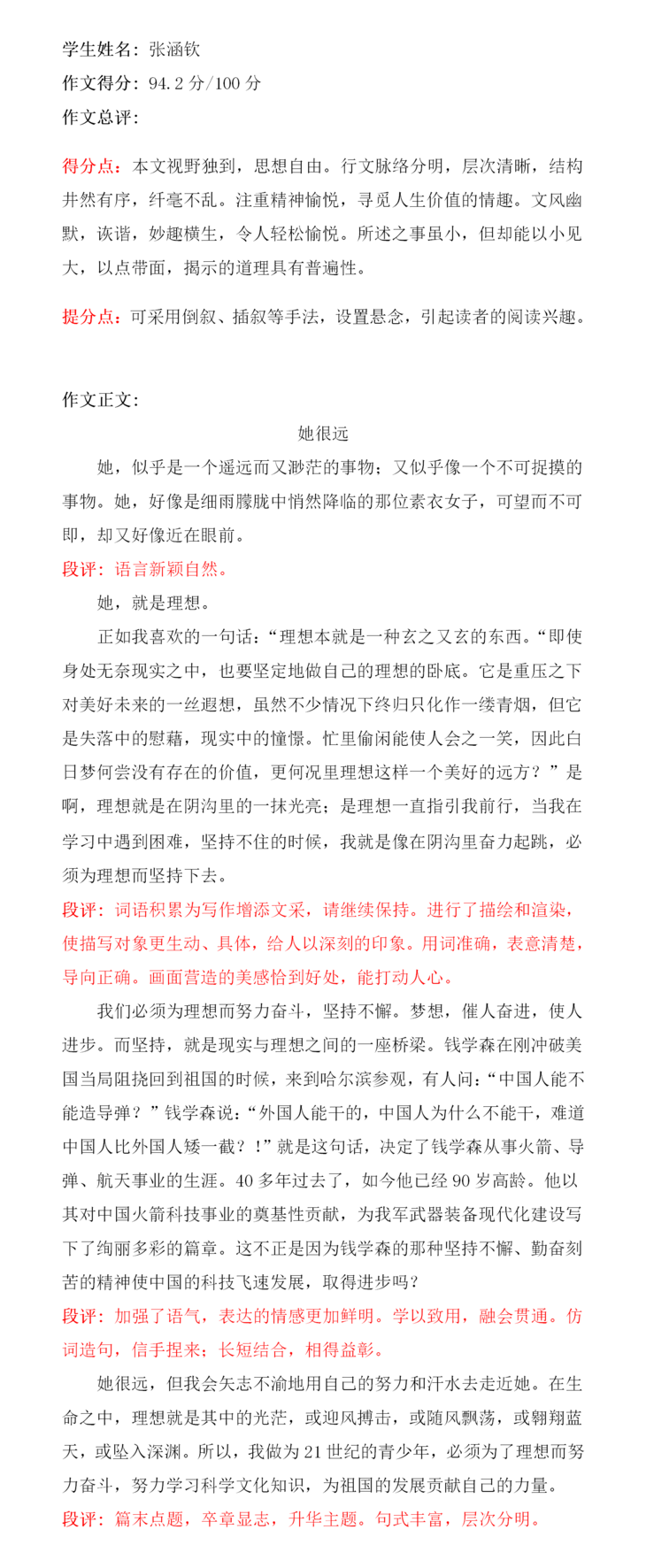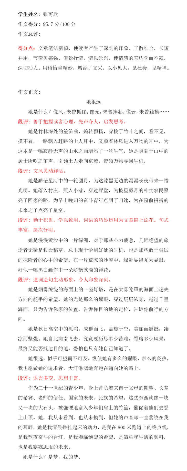 “她很远”短短三个字,很形象地诠释了现在梦想与我之间的距离,如果说青春是路,那梦想就是远方;如果说青春是点点星光,那梦想就是熠熠银河;如果说青春是潺潺小溪,那梦想就是汪洋大海。我出生于小城市,但并不代表我的心、我的梦也只拘泥于这里。微风不燥,花开正好,生活明朗,万物可爱,未来可期,既然脚踏青春这条路,那我一定会拼尽全力地向“她”奔去。“越努力,越幸运”,相信星光不负赶路人,也相信“她”会一直等着我。