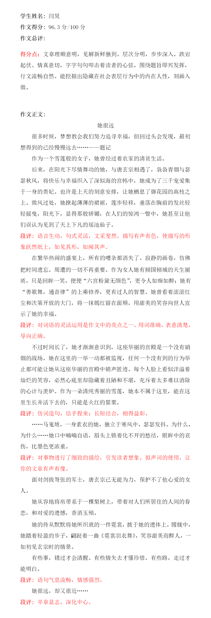 春风桃李花开日,秋雨梧桐叶落时。天长地久有时尽,此恨绵绵无绝期。文章以已走远的杨贵妃以风华绝色艳冠三宫粉黛却最终梦断马嵬坡的悲惨结局揭示了女子追求幸福和爱情最初选择的重要,令人深思,发人深省。此文构思精巧,语言凝炼,意蕴悠长,可见其才思敏捷,善思善悟。希望闫炅继续以灵秀之思独特之悟多品常练,写出出更为精美的习作。